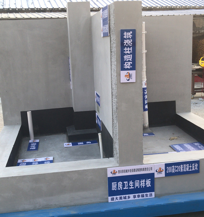材質及做法:包含墻體砌筑、構造柱澆筑、整體墻面粉飾、根部C20素混凝土反坎200高、污水立管安裝、透氣管安裝、等電位端子箱預埋、通風排煙、廚衛地面工序做法等工藝。
