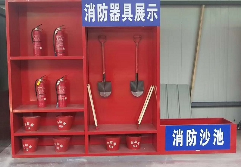 2、消防柜展示包含各類滅火器材,滅火器、水桶、鐵鍬等.
